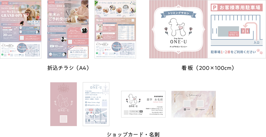 折込チラシ、ショップカード、名刺、看板は、WEBサイトと同じ女性らしい雰囲気を保ちつつ、それぞれに一味加えたデザインにいたしました。